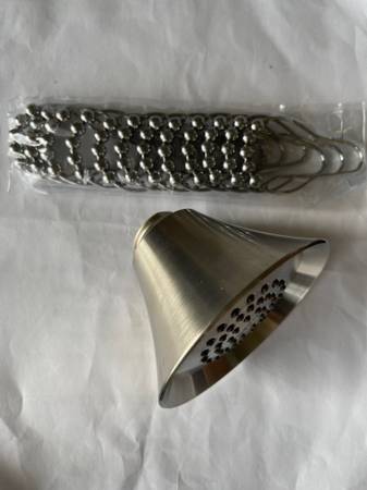 New Moen 2.5 GPM brushed nickel shower head, $65 on Amazon. New, never opened Moen shower curtain rolling rings, 12pk chrome, $13 on Amazon. New, never opened Moen Brushed Nickel Shower curtain rod...
