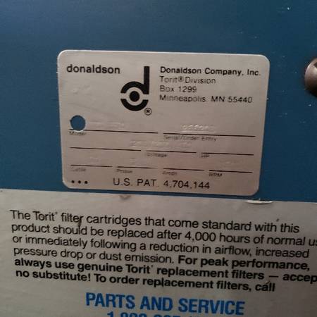 TORIT VS 550 DUST COLLECTOR MODEL VS-550 CFM 550 FILTER AREA 65 ft2 DUST DRAWER VOLUME 1.8 CU FT SOUND dB(A) 69 CARTRIDGE STAGES 2 SHAKER YES INLET 5" PHASE 3 MOTOR HORSEPOWER