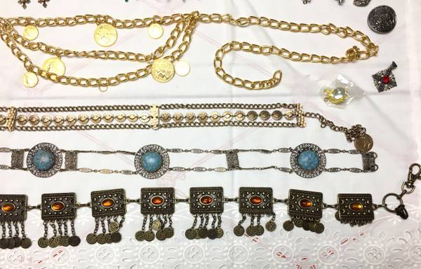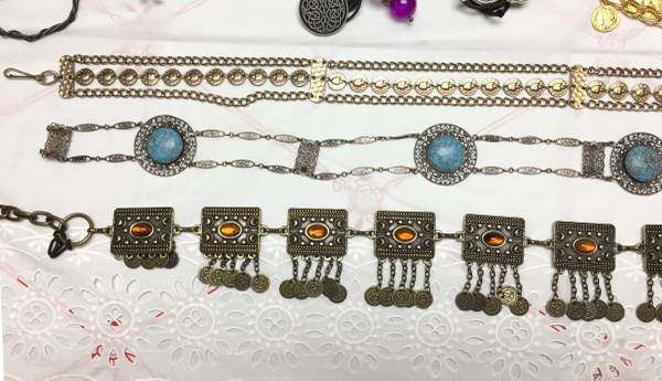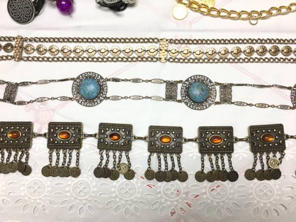 Large Lot of Renaissance/Mediaeval/Steampunk/SCA/LARP Jewelry - This large lot of costume jewelry includes necklaces, bracelets, earrings, rings and many belts. There are also a couple ear cuffs as well. The two arm bracelets in the packages are dragons. The black necklace is damaged and should just be used for parts or redesign. $80 for the whole lot