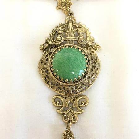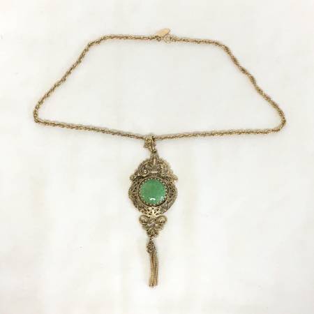Vintage Whiting & Davis Gold Color Green Cabochon Tassel Necklace - This lovely ornate metal necklace features a large green cabochon stone in the center with a tassel hanging from the bottom. The chain is approximately 19" long, the pendant is 4.5" long (from hook to bottom of tassel) and the green stone is approximately 7/8" in diameter. Made by Whiting & Davis and has it's hang tag label.