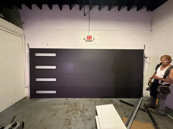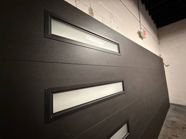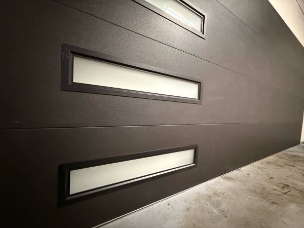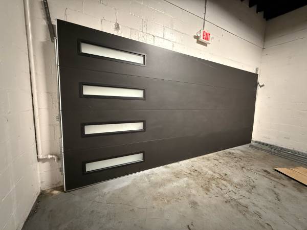 Used 16x7 Modern Lustra Black Flush Garage Door 2” three layer insulated steel back Polyurethane insulation RValue 18.4 Slime stacked windows down left side Frosted glass Includes tracks, torsion...