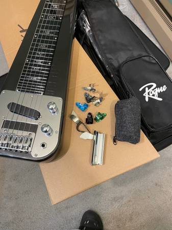 Rogue lap steel guitar brand new, just bought a week ago, its just not for me. cost too much in shipping to return lap steel guitar, with stand, bag, tone bar and finger picks brand new!! 3one three...