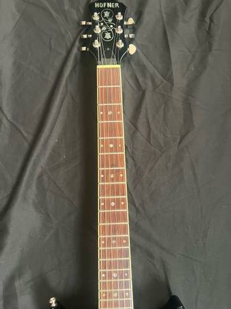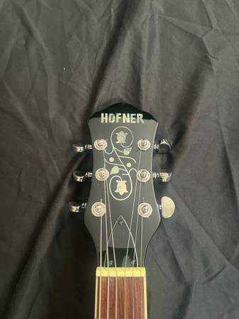 * Body and Neck: A solid, double-cutaway mahogany body and neck contribute to a warm and resonant tone. The headstock has the Hofner logo and “sick” inlays.