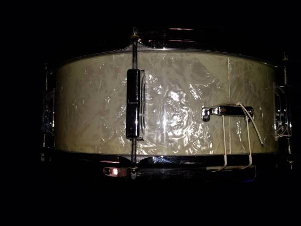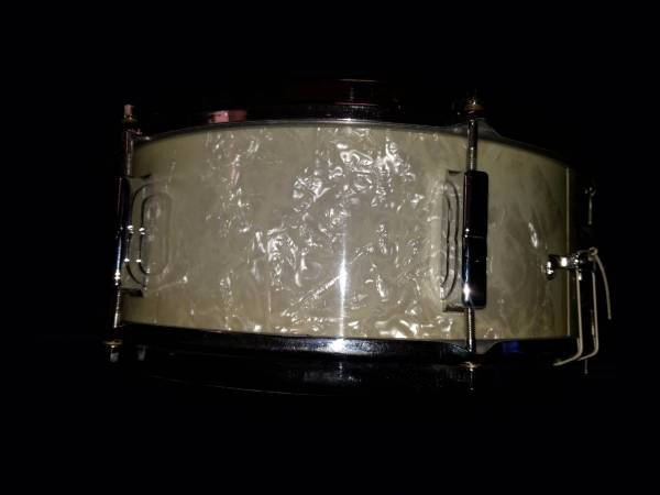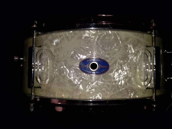 LEEDY Chicago Blue Oval Badge Frank Capp model. Very pristeen condition.Original White marine pearl wrap,chrome over brass hoops and hardware,rapid strainer,3 ply maple shell. Excellent Be-bop snare.Full open sound.Hard to find em this nice anymore at this price!!.Mid 60's vintage. $400