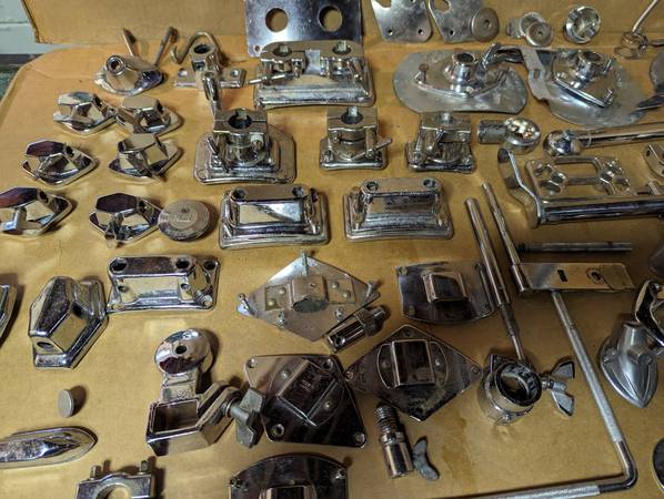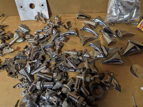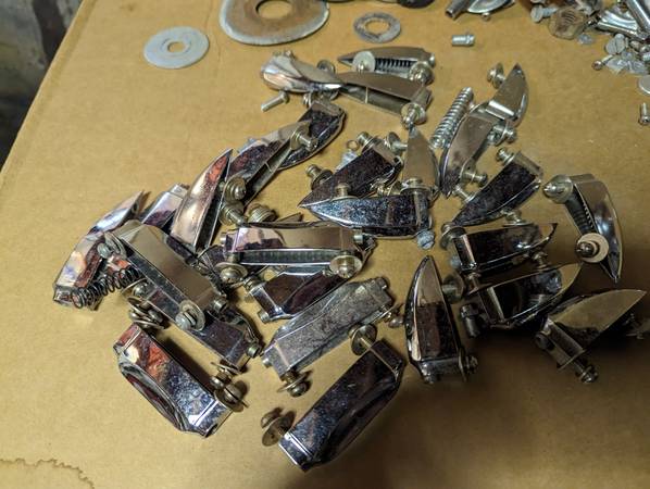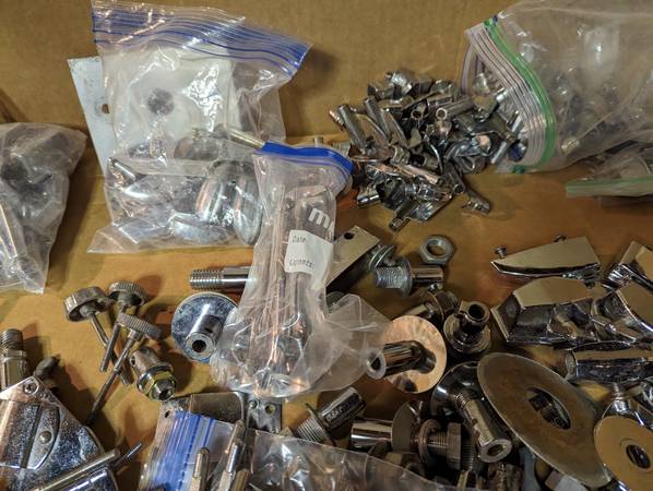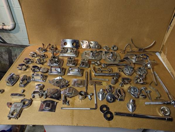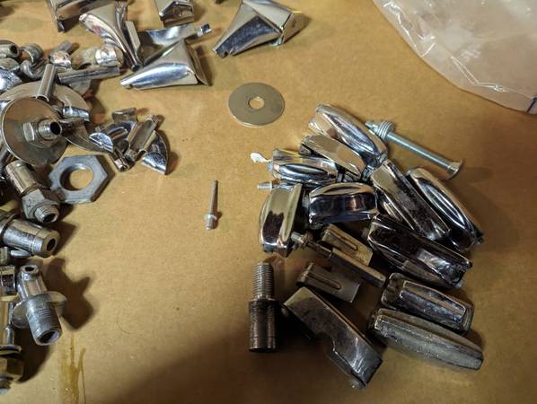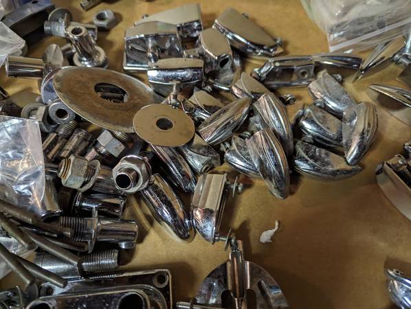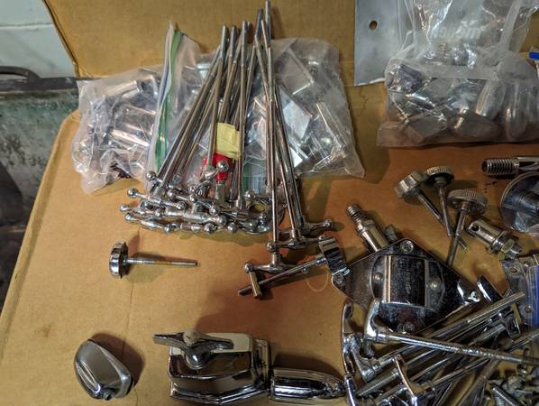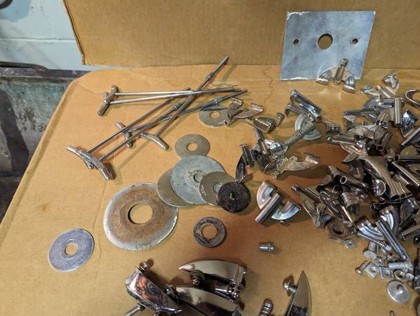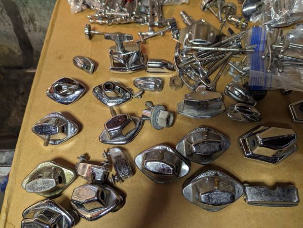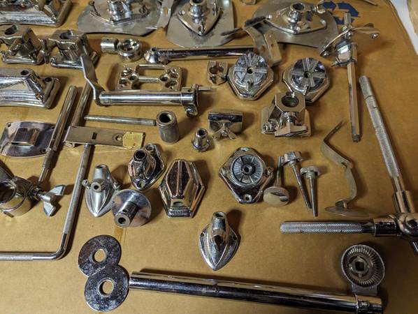 VINTAGE JAPANESE STENCIL DRUM PARTS FROM THE 1960'S. ITEMS ARE $4 EACH AND UP. PLEASE SEE PICTURES FOR ITEMS YOU MAY BE LOOKING FOR TO DO YOUR RESTORATION. I HAVE LUGS, T'S, CLAWS, BASS MOUNT CYMBAL HOLDERS, TOM MOUNT BRACKETS, BASS DRUM SPUR BRACKETS, TOM MOUNTING PLATES, FLOOR TOM BRACKETS, BASS DRUM CONSOLLETS,ETC. GOOD SELECTION OF PARTS.STAR,HOSHINO,NORMA,PEARL ETC PLEASE CALL show contact info