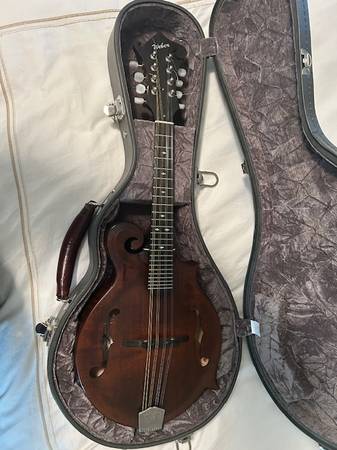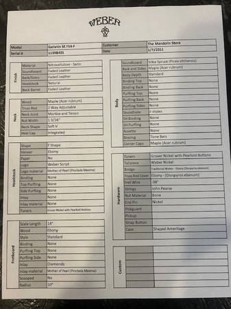 Gallatin F14-F Mandolin Specifications: Traditional F top body type, hand graduated and tuned; solid sitka spruce bracing; tone bars; maple back / ribs / neck; nut width 1 1/8"; unbound ebony peghead veneer; Weber script logo peg head inlay; unbound ebony fingerboard; unbound top and back; faded leather finish; satin nitrocellulose lacquer; dual action truss rod; adjustable bridge; adjustable ebony bridge tuners / nickel hardware; 24 frets; scale length 14 inches; delux shaped hard shell case.\