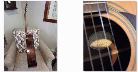 Perfect worry free guitar (BECAUSE OF PRICE) for camping, cottage having fun, or beginner trying to see if this is the right instrument to learn. Although this is what this guitar was bought for it is in excellent condition. Most importantly the neck is straight, fret board is good, the body is free from scratches. Natural top, mahogany neck, back and sides, ebony fret board. Currently has old strings on it.
