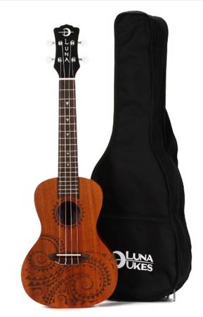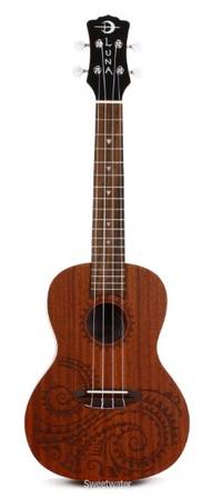 Luna Tattoo Concert Ukulele - This has been set up and tuned but not used as I have too many on hand. I am making room in my home and this will have to go. Comes with case and extra strings. This can be tuned either High or Low "G" depending on your preference. Sound is very good either way. Porch pick-up, cash only please