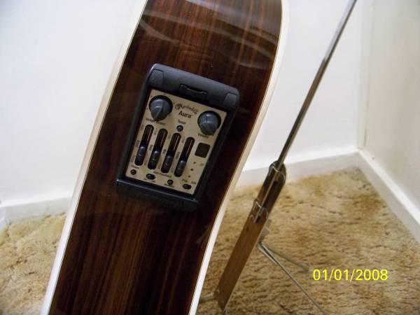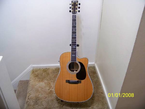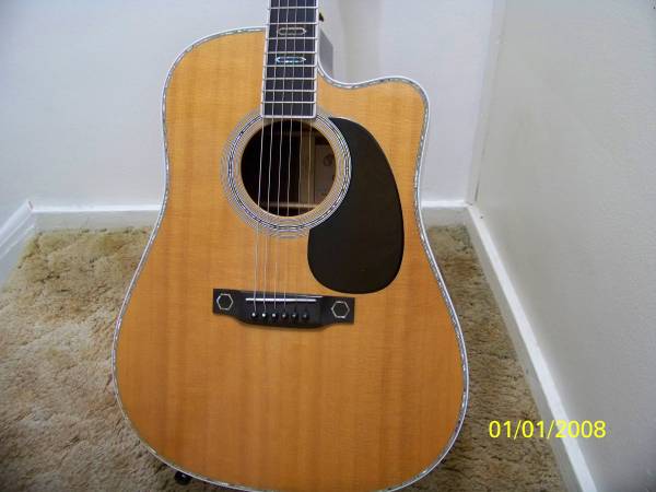 Martin Aura guitar. Limited edition guitar with lots of inlays and Fishman Aura electronics. There are six sound presets our you can set your own tone presets or just use the tone controls. Martin made other Aura guitars but this is year they put all inlays on it. Guitar has been lightly used and in great condition. The electronics were updated at Elderly Music in Lansing that is an authorized dealer and repair. The original developed a defect. Would keep but cannot play it much any more.