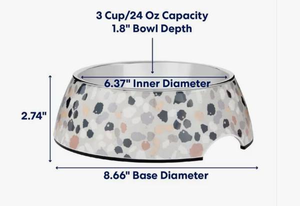 • Melamine base features a terrazzo pattern that elevates your dog’s dining experience.