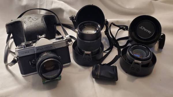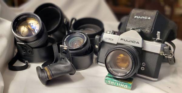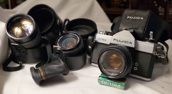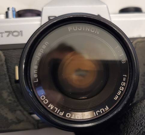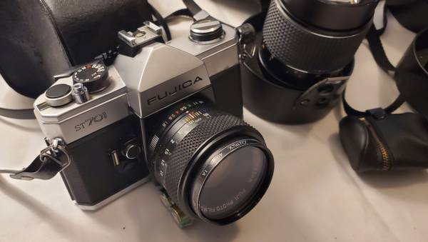 The Fujica ST701 was introduced in 1971 and is known for being the first SLR camera to use a silicon photodiode for its light sensor, offering better performance than the then-standard CdS photoresistor.