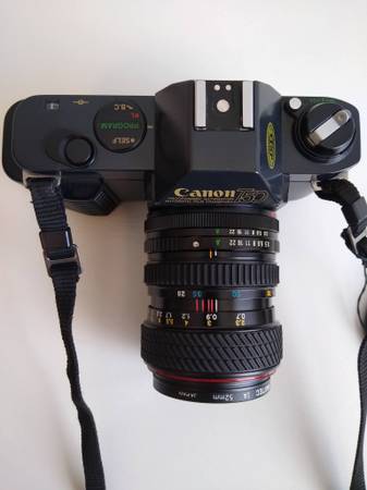 Includes Tokina Macro 28 to 70 MM lens (as shown mounted on camera) and original Cannon FD 50 MM lens, plus protective lens caps and lens UV filters.
