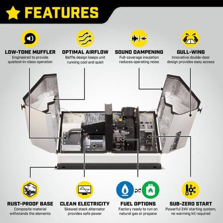- Fully Automatic 24/7 - No refueling, manual operation, or extension cords needed. The 8.5kW generator operates on your home's natural gas or propane fuel supply.