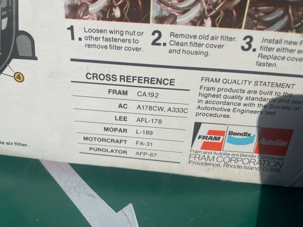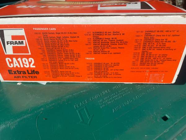 I have a Fram CA192 air filter for sale. Look at the pics. Shipping available. GM, Buick, Chevrolet, Pontiac, GMC, Regal, 1979, 1980, 1981, 1982, 1983, 1984, 1985, 1986, 1987, 1988, 1989, 1990,...