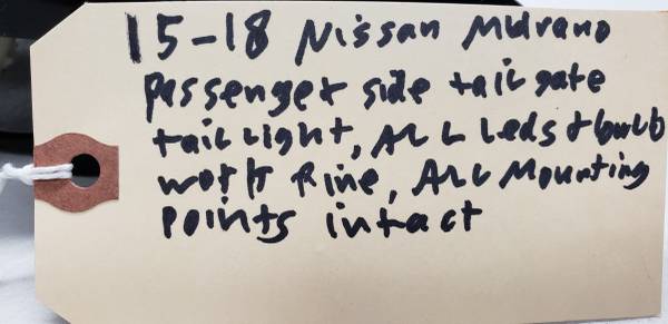 15-18 Nissan murano passenger side tailgate taillight,used,OEM, excellent condition,all bulbs and mounting points intact, all LEDs work fine, please call or text 313 five nine zero 1139,please leave a message if I don't answer and I will get back to you as soon as possible,thank you.