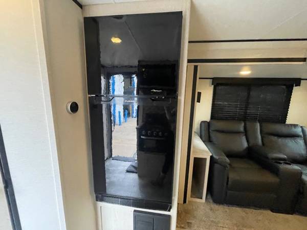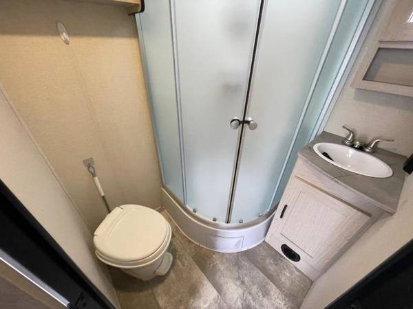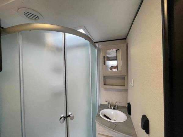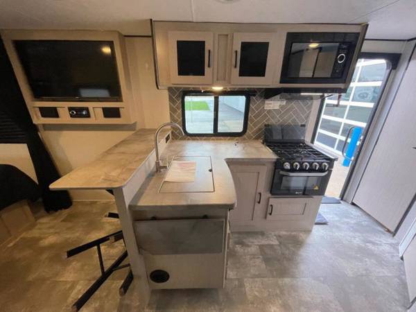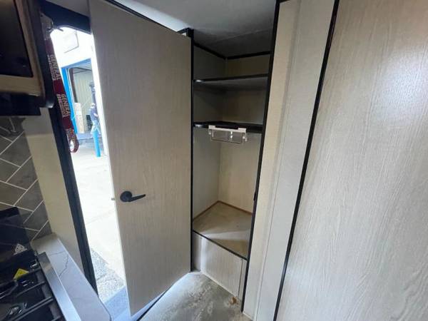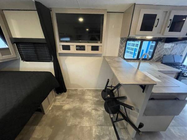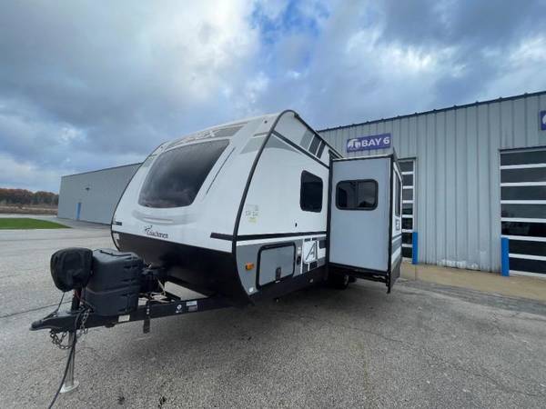 This 8' wide travel trailer is perfect for those looking for fun and adventure. After you've spent your day outdoors, get cleaned up in the full bath before relaxing on the sofa slide out. Dinner can be prepared on the three burner cooktop or in the microwave oven, and you can dine at the bar with two stools. There is also a countertop extension in the kitchen the chef is sure to appreciate. The queen bed with super storage will provide a place to rest up each night and store all your belongings, and there is an exterior pass-through storage for your larger camp gear!
