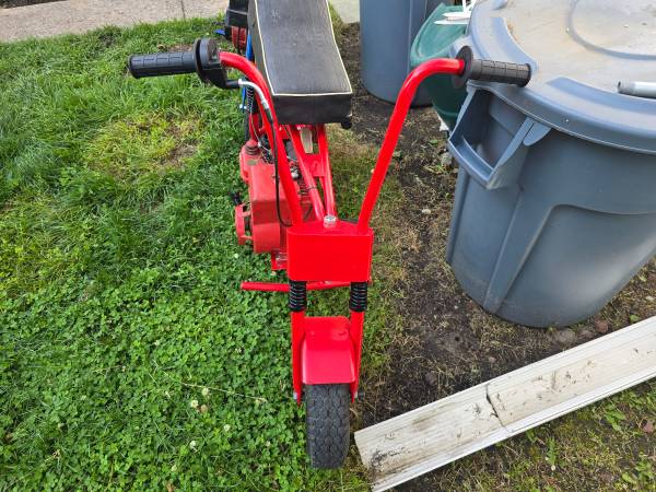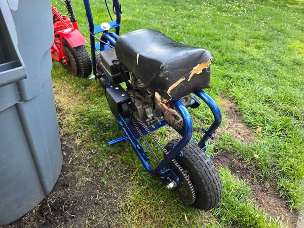 Blue mini bike has a big block Tecumseh h50 motor runs and rides newer build and paint, and has the ability to have handle bar killswitch hooked up. I personally didn't hook up wires being the motor has it's own. Seat has seen better days.