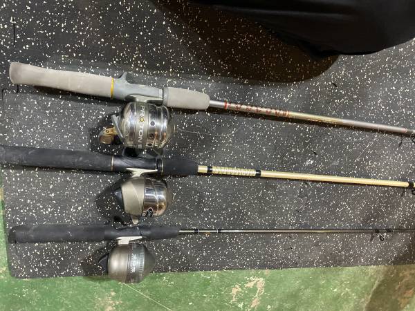 3 fishing rods, reels, strings and all accessories together 4 sale. 1 rod) 202 Authentic Zebco 2 rod) Proton 3 rod) Shakespeare Synergy 10