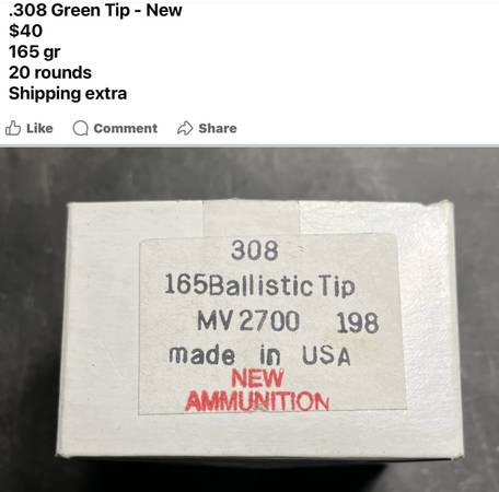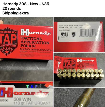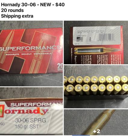 7.62 @ $40 30-06 @ $60 308 @ $40 22 @ $200 22 @ $75 30 @ $25 30-06 @ $40 308 @ 35 223 @ $40 Sold out lantern, stove n antlers.