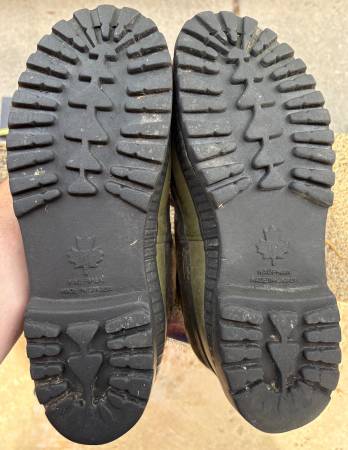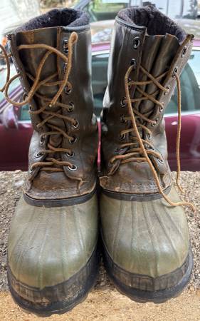 1) Men's Kaufman/Sorel boots with green leather uppers and green/black rubber bottoms, size 11, made in Canada. Includes Kaufman felt liners. Measure 10" tall. Leather shows some wear right above the stitching attaching the rubber bottoms. $10