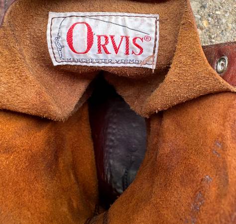 3) Men's Orvis moc boots in brown leather, size 11E, assumed to be made in USA. Vintage 80s. Has Gro-Cord soles. Measure 10" tall. There is a waxlike coating on the leather-- my dad used Sno Seal on boots that would be wet or snowy, so perhaps that's what I'm seeing and feeling on these boots? $20