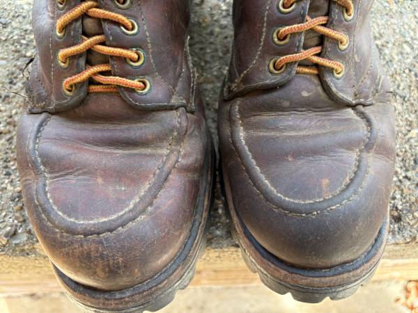 2) Men's Danner moc boots in brown leather, size 11D, made in Portland, Oregon. Vintage 80s or 90s. Has Vibram soles-- the presence of nails makes me wonder if these boots may have been resoled? Measure about 9" tall. Brass eyelets have a bit of corrosion. $10