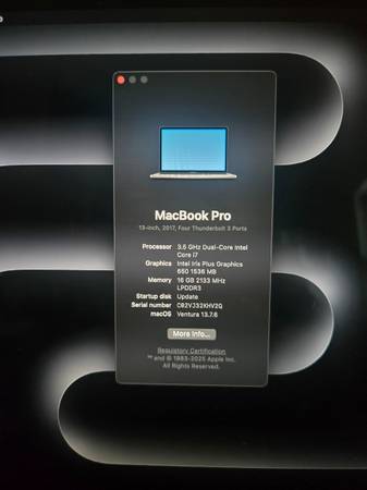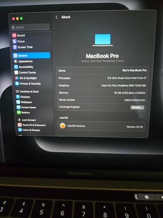 A bit long in the tooth, but still quite servicable! i7 dualcore, 16GB RAM, 512GB SSD. Soft carry bag, aftermarket power supply and small USB/card reader hub included. Ready to rock with the last version of Ventura. Price is firm & cash is king, please & thank you!