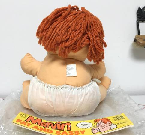 1983 "Baby Marvin" Stuffed Doll - This is a representation of the baby from the 1980's comic strip "Marvin". He is stuffed and super soft and cuddly. The doll is in a fixed sitting position and is about 12" high (sitting). Includes his original packaging, though it has been opened.