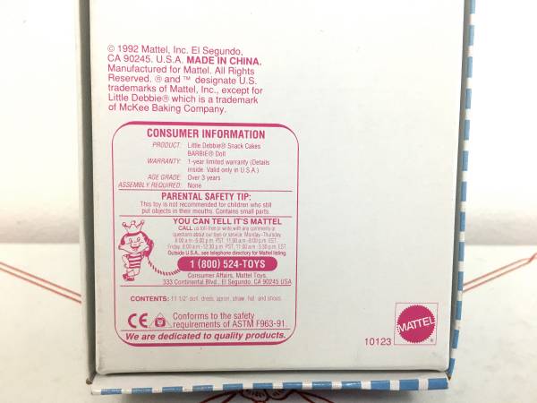 1992 Mattel "Little Debbie Snack Cakes Barbie" Doll - New in Box - This Barbie is brand new in her box and includes her bag of accessories. Made by Mattel. Model #10123.