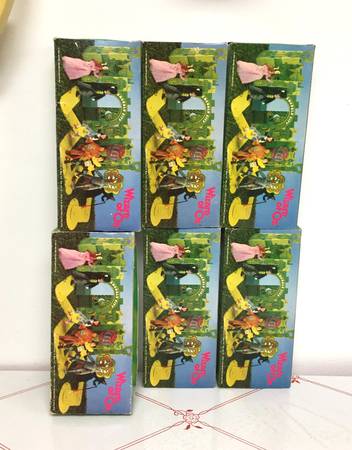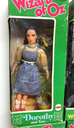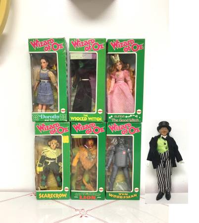 Complete Set of Seven Vintage 1974 "Wizard of Oz" Dolls - by Mego - 7.5" tall - This is a complete set of Wizard of Oz dolls that go with the "Emerald City Playset". The only one missing his box is the Wizard. The other six are in their boxes and look like they've never been played with. These dolls are very poseable where their heads, shoulders, elbows, wrists, thighs, knees and ankles all move. $140 for all seven dolls.