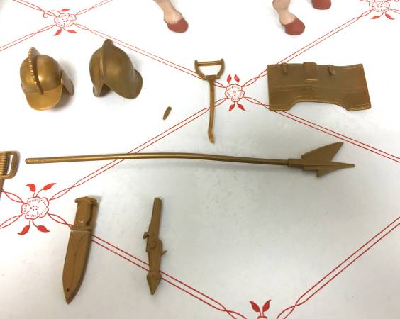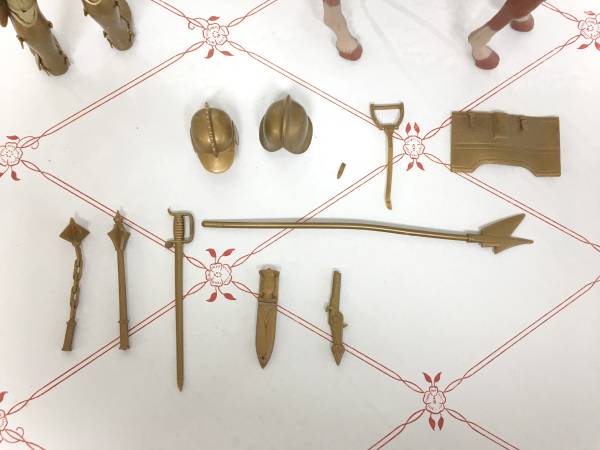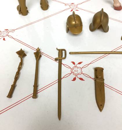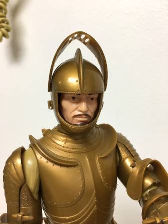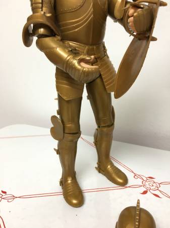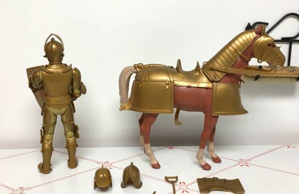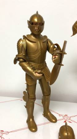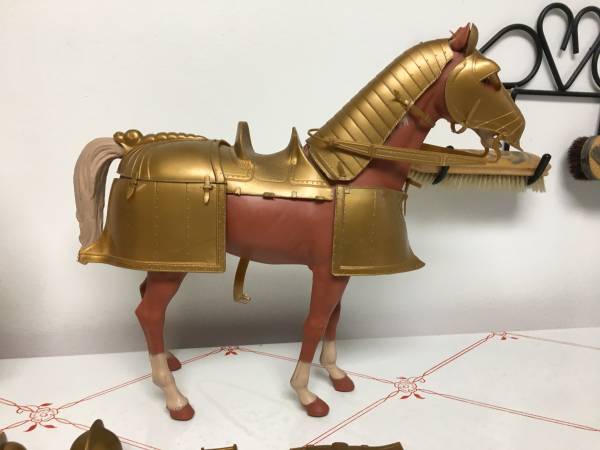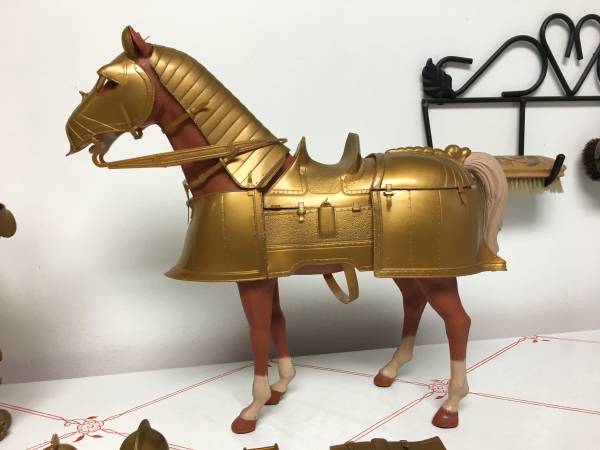 For sale is this AWESOME poseable 1968 "Sir Gordon the Gold Knight" and his horse "Bravo" figures. They come fully clothed in their armor. I didn't want to take their armor off for fear of damaging it, but the figures underneath seem pristine. One side of the horse's armor is off (I think the clips are broken) and one stirrup is missing. The knight is completely poseable and bends at the knees and elbows. This toy is super well made and an absolute joy to look at. He is approximately 12" tall with his helmet on.