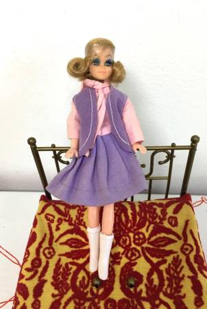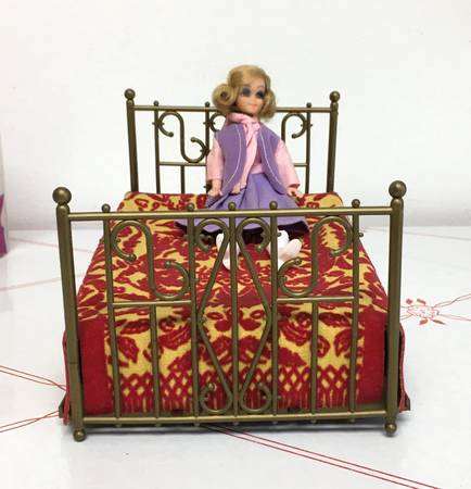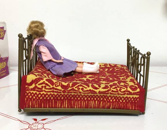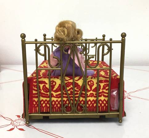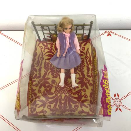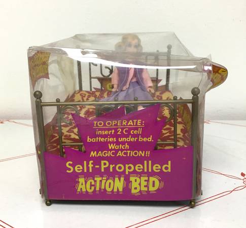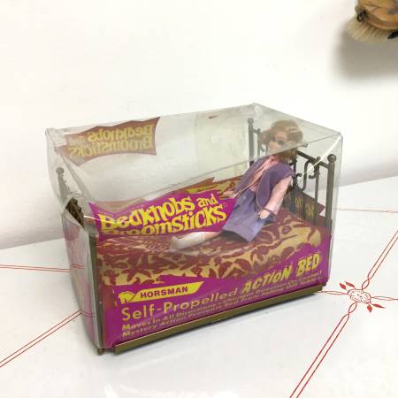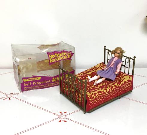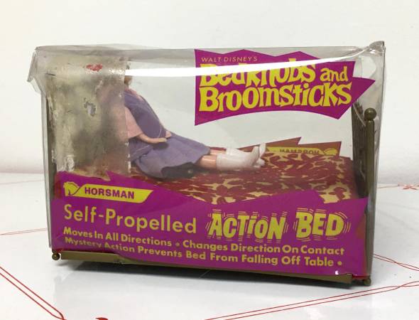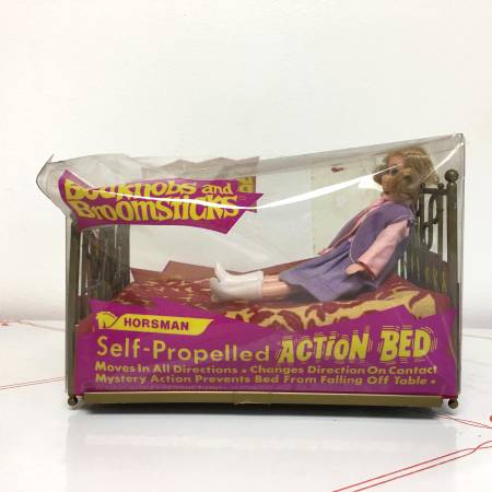 Vintage 1972 Horsman Disney's "Bedknobs & Broomsticks" Action Bed - This is a very rare item. It is Miss Price's self-propelled action bed from the movie. Even includes the Miss Price doll (the size of a Dawn doll). It is supposed to move around the floor with two C batteriesand has the "mystery action" that keeps it from falling off a table. Unfortunately, despite the battery compartment being perfectly clean, it does not work. It includes its plastic packaging cover, but that is crunched in places and is damaged. Although the bed and doll are in excellent displayable condition, the plastic covering does need a clean as it is dusty. Model #9901.