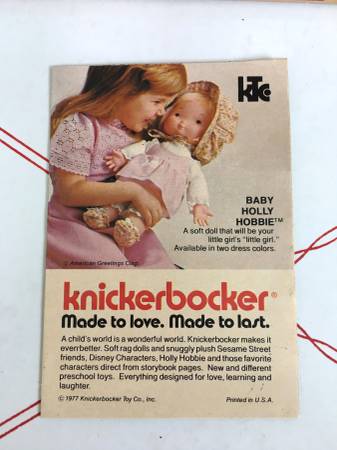 Vintage 1977 Knickerbocker "Baby Holly Hobbie" Doll - This cute, soft, cuddly babby doll is brand new in her box. Vinyl head, hands and legs below the knee. Wearing a yellow dress. Includes pamphlet. Approximately 14" tall. Model #3415. Made by Knickerbocker. $30