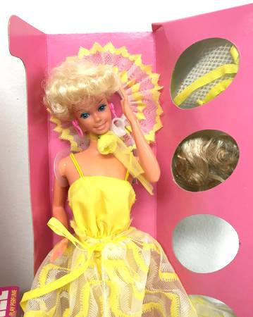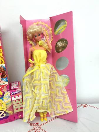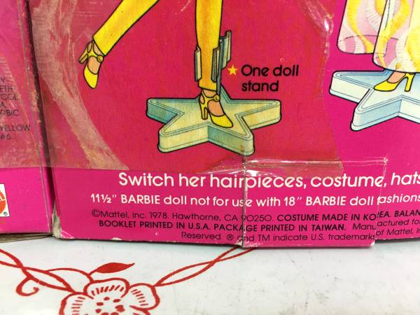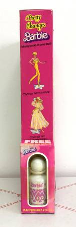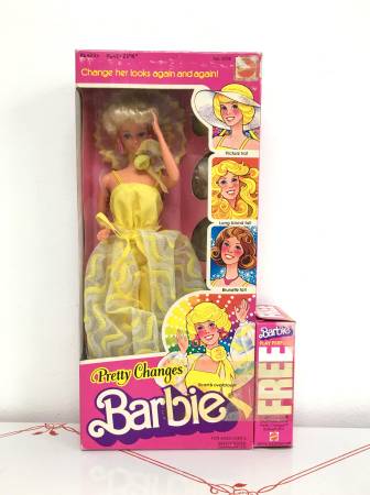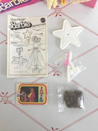 Vintage 1978 Mattel "Pretty Changes Barbie" - This Barbie is new in her box. Since the box could be opened, I pulled everything out for you to see. Includes the doll, pantsuit, wrap-around skirt, hat, earrings, shoes, flower necklace, two wigs, stand, hair brush, barrette, pink necklace, directions and pamphlet. There are two mesh with yellow items packaged. They are sealed, but look to be either more hats or shorter skirts. Also included is a bottle of Barbie perfume. I see some discoloration on that little box so can only assume some (if not all) has leaked out. I have no idea what the condition of that perfume bottle is. Model #2598. $100