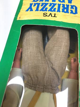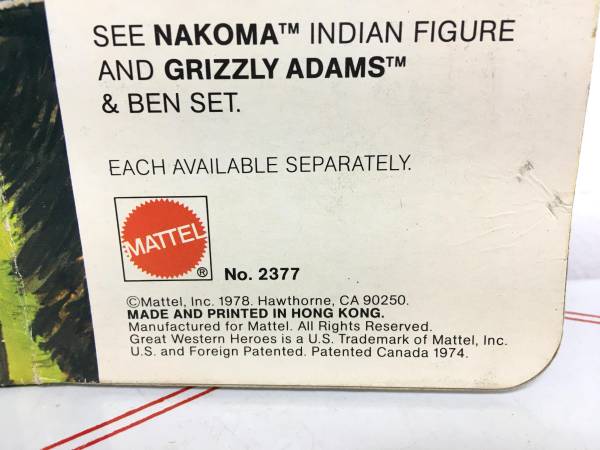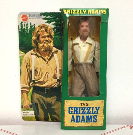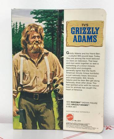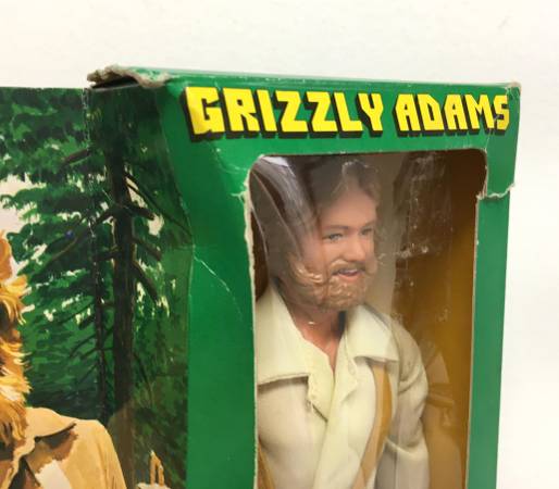 Vintage 1978 Mattel "Grizzly Adams" Poseable Action Figure - This figure is still new in his sealed box. Comes with a bag of something, but I can't make it out. Probably his axe. The box is in pretty condition, but does have one rip on the front and is pushed in a bit on the left side (photo shown). Made by Mattel. Model #2377. He is approximately 9.5" tall.