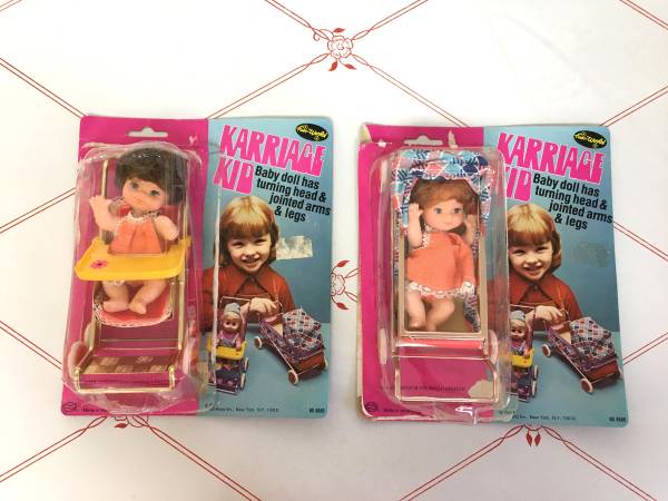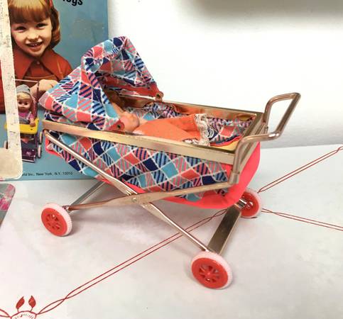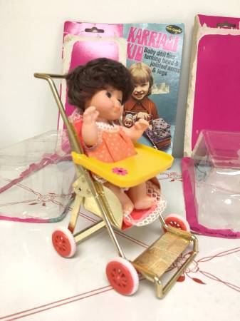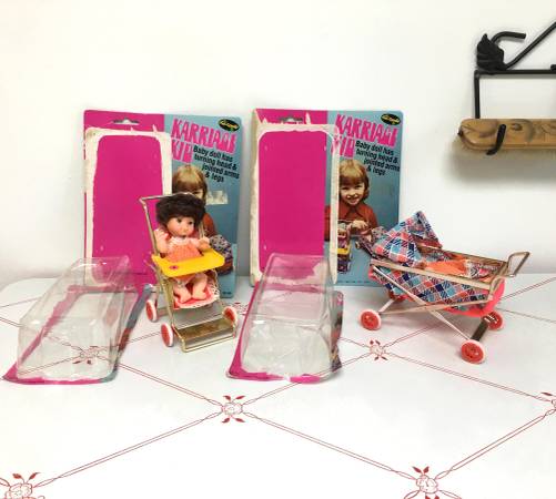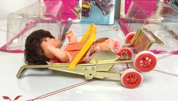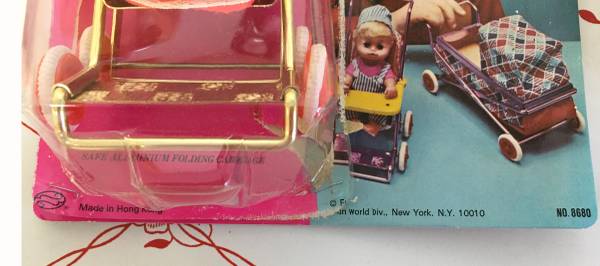 Vintage 5.5" Dolls in Collapsible Stroller & Carriage - How adorable are these little 5.5" plastic dolls?! One comes with a stroller and one with a carriage. The frames of both items are made of metal and are collapsible. Each set even comes with their original packaging. Made in Hong Kong for "Fun World Division". $10/each set