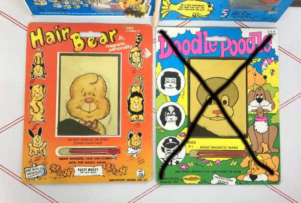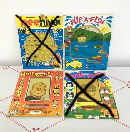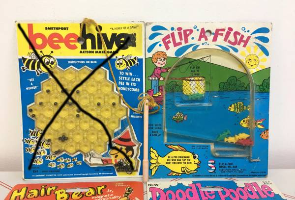 Vintage Portable Travel Games - Hair Bear, Bee Hive, Flip-a-Fish - Four wonderful vintage travel games. The Bee Hive game is dated 1978, the other two are the 1990's. Very nostalgic, especially the magnetic hair ones. Made by Smethport Specialty Co. $5/each.