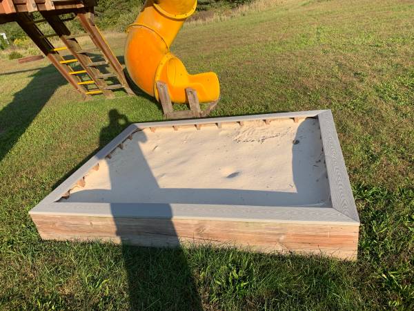Heavy duty sandbox with Trex seating. 6’ x 8’ feet. White beach sand. Appx 3 years old. Very good condition. You empty and transport.