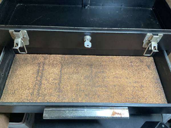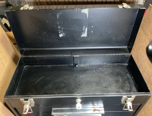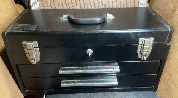 Nice older box. Has one key, lock works. 10-3/4”H x 8-5/8”W x 20-1/2”L