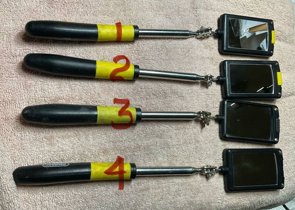 Choice @ $4 each General Hardware 80560 1-1/2” x 2-1/2” shatterproof glass. 12” to 33” 2x LED lights. Uses 2x CR2032 batteries. Batteries are dead.
