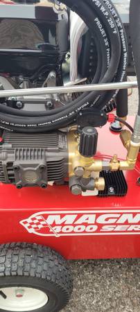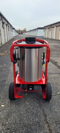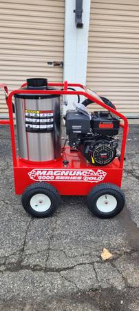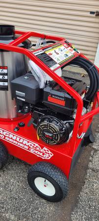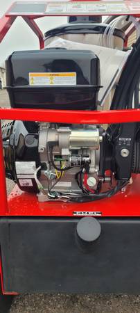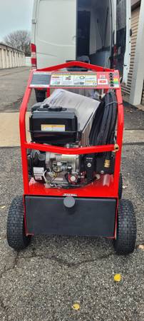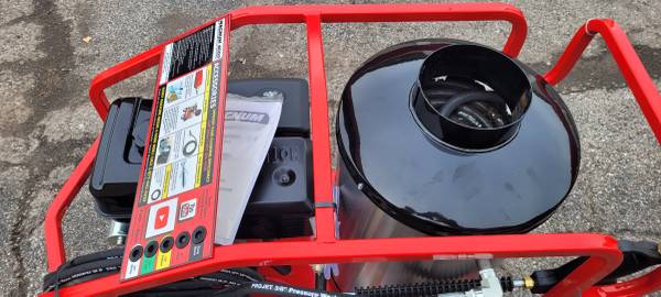 New heated pressure washer, 210 degrees F discharged water, includes black and yellow nozzles with wand, 3/8” prowash 4000 psi hose, 3.5 gpm pump, oil/diesel fired burner with adjustable thermostat, electric start 15hp gas engine, does not come with battery, 12 volt, 165 cca, 8"x5"x6"