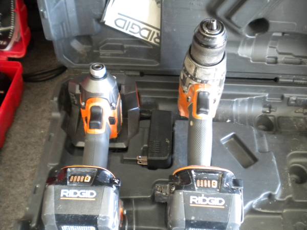 RIDGID 18V Brushless 2-Tool Combo Kit with R861152 Brushless High Torque Hammer Drill/Driver, R862312 Brushless 4-Mode 1/4 in. Impact Driver, AC840060 6.0Ah MAX Output Battery, AC840040 4.0Ah MAX Output Battery, Charger and Hard Case. Good condition, everything works fine. Comes as seen in pics. Please call show contact info