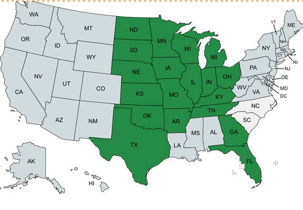 -Midwest lanes (MI,OH,IL,IA,NE,MN,WI) & South primarily (GA,NC,SC) / PA furthest east / TX farthest west