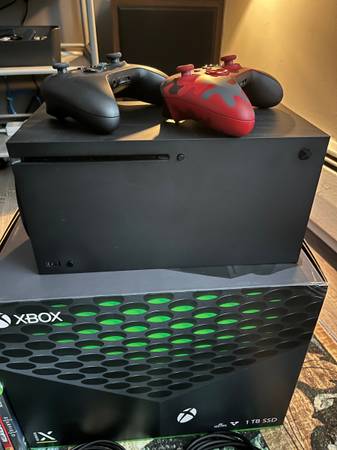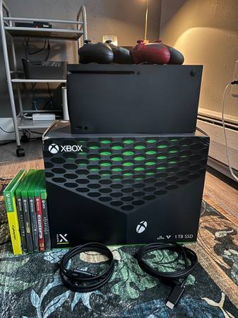 Gently used Xbox series x (fresh reset) with two Microsoft controllers, original power and hdmi cables, original box, and 7 games. Microsoft recently raised price of Series X to $599 with no extra controller or games. Per and smoke free home. Calls or text only. No emails. Apple Pay or Cash ONLY!
