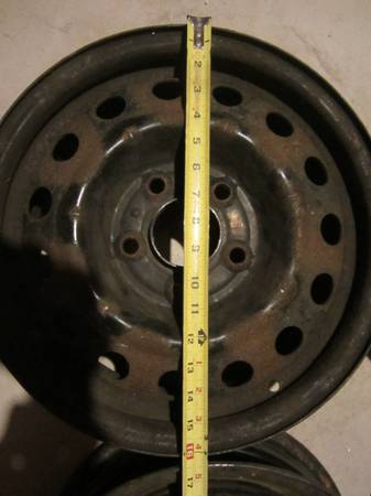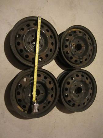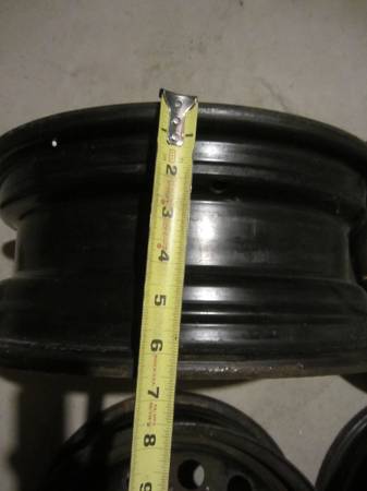 Set of four 15" steel wheels. Center-to-center distance is 2 5/8" between adjacent holes and 4 1/4" across 2 holes. The center hole is slightly over 2 5/8" diameter. Width is 6 1/2" overall and 5 1/2" where the bead sets. I don't remember what they fit! Take them and if they don't fit your vehicle, bring them back. Call show contact info