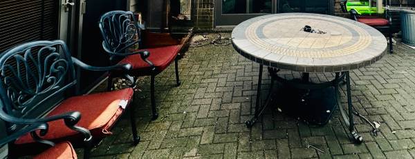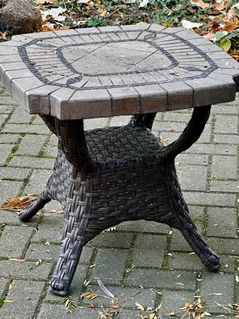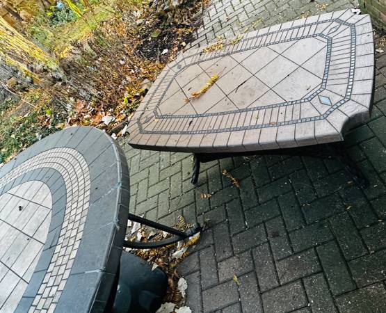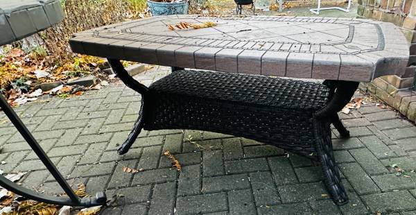 Moving! Up for grabs are: 1 - patio table, heavy and real tile. (5' across) solid metal legs 1 - giant umbrella with base 1- matching end table 1- matching coffee table YOU must move yourself, hours...
