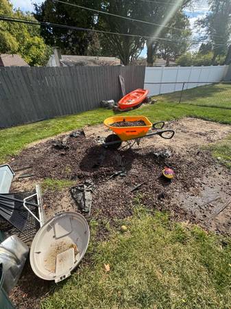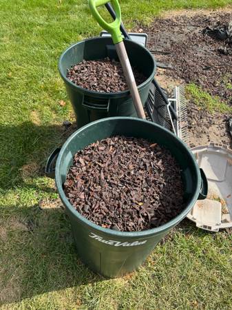 Vigoro Rubber Mulch got rid of a playground and no need for it anymore. Enough to fill two trash cans, a wheelbarrow plus more. Free to pick up. Trash cans + wheelbarrow not included.