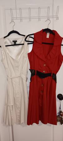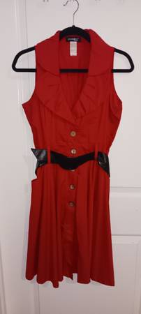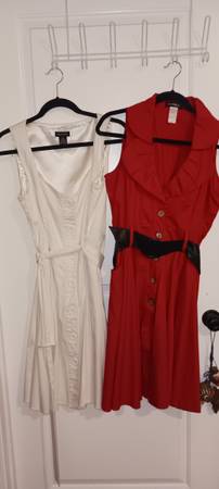 2 1950's Marilyn Monroe - Like Belted Sleeveless Dresses - Sizes 8/10 The lighter dress says Size 10, the red dress is similar. Quite small sizes. Could be good for Hallween. I'll leave on the porch...